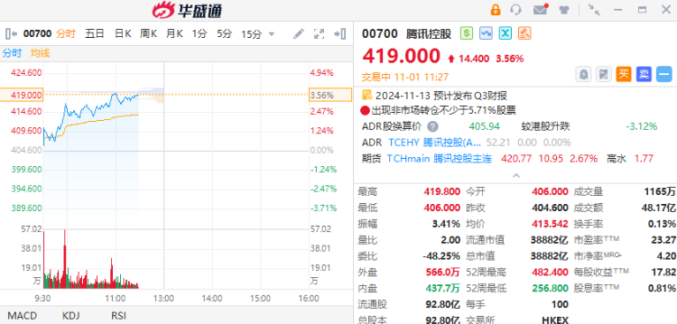 腾讯控股(00700)股价发力,截至发稿,涨3.56%,报419港元,成交额48.17亿港元。