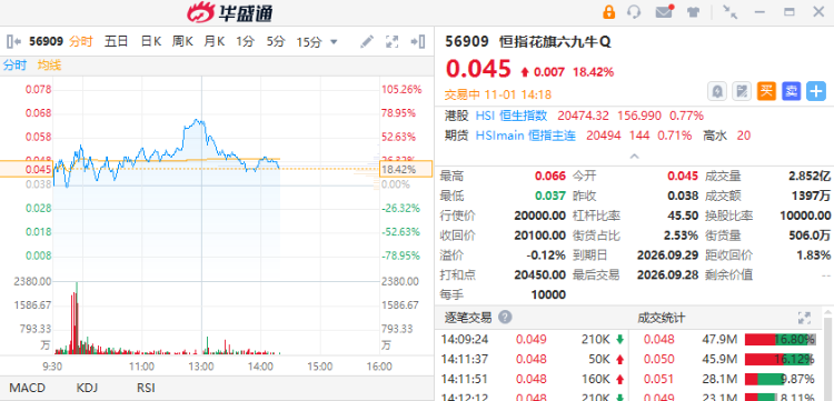 投资者如看好恒指,或可留意恒指牛56909 $56909.HK ,收回价20100点,槓杆比率40.2 倍,换股比率10000 兑 1,2026年09月29日到期;如看淡,或可留意恒指熊55717 $55717.HK ,收回价21000点,槓杆比率38 倍,换股比率10000 兑 1,2025年04月29日到期。