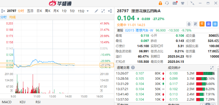 理想汽车 $02015.HK 昨晚公佈业绩,有分析认爲其第三季利润率降低,以及第四季交付展望偏向保守,股价在港今早曾跌逾一成至95港元位置。 投资者如看好理想,或可留意理想购28797 $28797.HK ,行使价145.1港元,实际杠杆3.3 倍,换股比率100 兑 1,2025年04月23日到期。