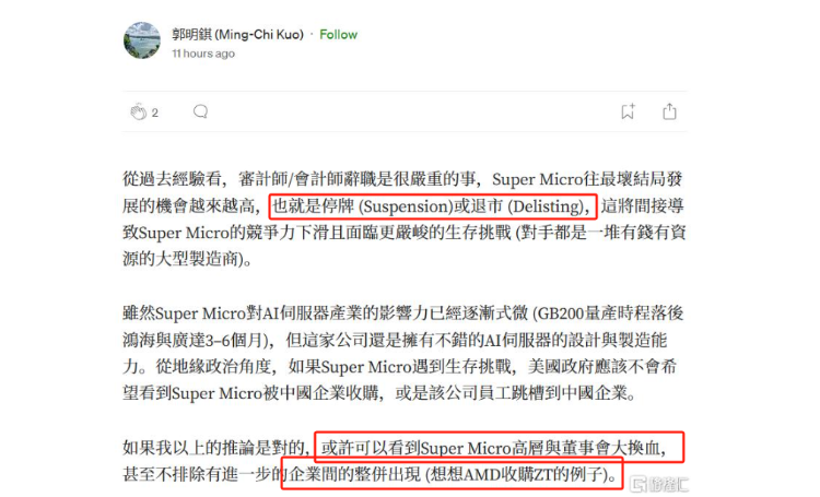 目前,超微电脑的市值已跌破标普500指数市值门槛,且因年报迟迟未能提交,在审计师辞任的情况下,公司还面临更大的摘牌风险。天风国际分析师郭明錤对此分析称,从过往经验看,审计/会计辞任是很严重的事,该股迎停牌或退市的“最坏结果”的可能性越来越高。
