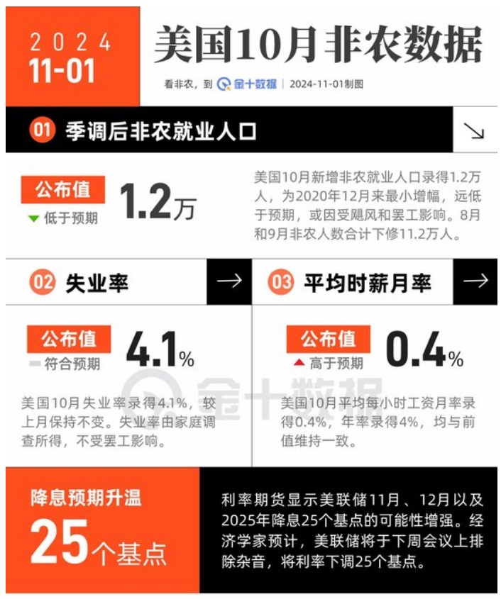 美国10月非农新增就业人口仅录得1.2万人,这一数据或受飓风和罢工影响,交易员增加了对11月美联储降息25个基点的押注……