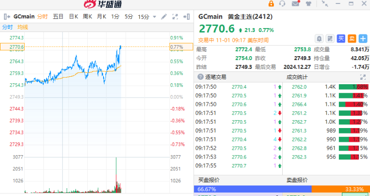 COMEX最活跃黄金期货合约北京时间11月1日20:30--20:31一分钟内买卖盘面瞬间成交3259手,交易合约总价值9.02亿美元