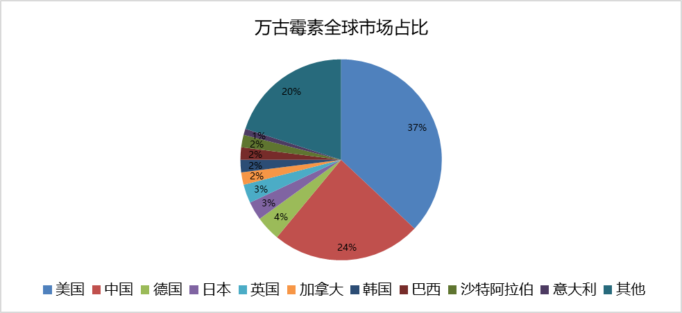 通过对IQVIA数据分析可以看出,美国和中国是注射用盐酸万古霉素全球前两大市场,分别占37%和24%,德国市场是全球第三大市场,占4%,英国和加拿大分别是全球第五和第六大市场,分别占3%和2%的市场。