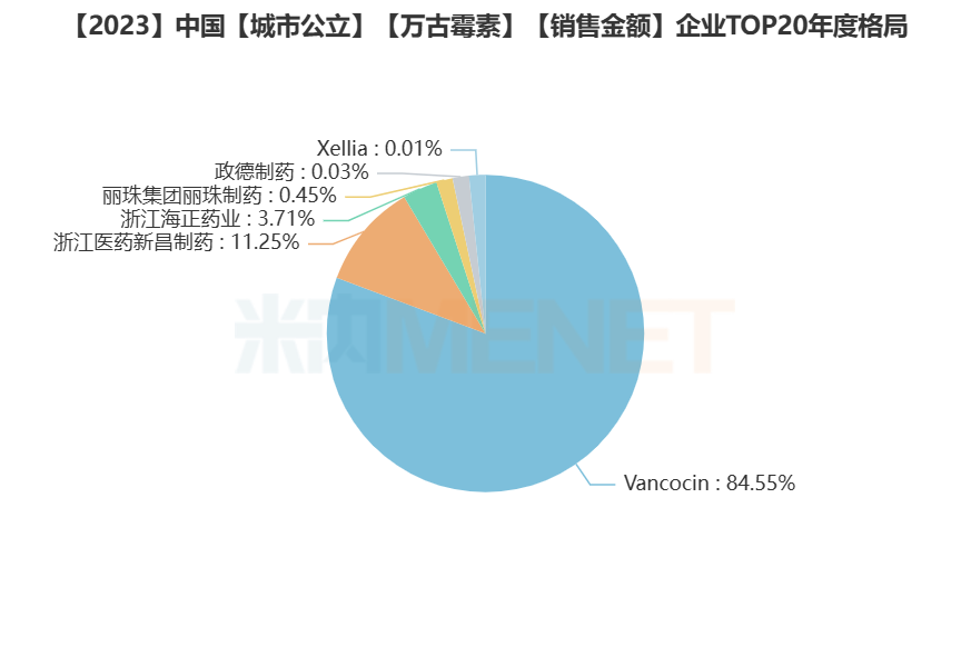 根据米内网数据显示,注射用盐酸万古霉素2023年的国内市场容量为23.8亿元,其中城市公立为20.7亿元,占所有销售终端销售额的87.35%。