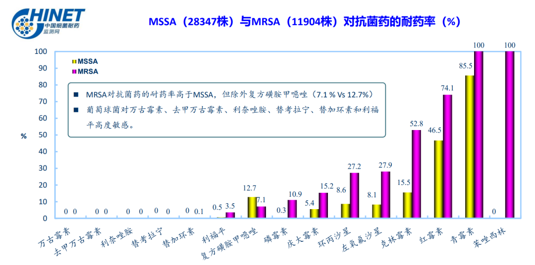 根据2023年全国细菌耐药监测报告,2023年临床分离菌种中金黄色葡萄球菌检出率为9.23%,在所有分离菌种中排第3位,其中甲氧西林耐药金黄色葡萄球菌检出率占整个金黄色葡萄球菌37.5%。另外,根据监测报告,甲氧西林耐药金黄色葡萄球菌对万古霉素的耐药率为0。