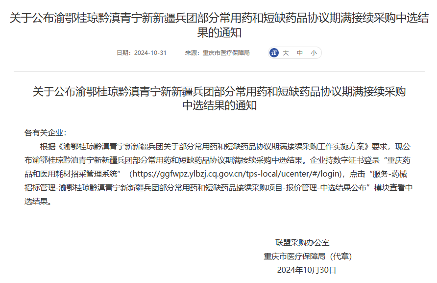 此次普利万古注射用盐酸万古霉素在重庆联盟接续采购中中选,是以第一顺位中选,意味着后续医院勾选概率增加。普利制药以高品质、高性价比万古霉素满足临床治疗需求,也充分体现普利制药积极响应国家政策,对减轻患者负担、节约医保基金支出、提升医保基金使用效率具有重要的意义。