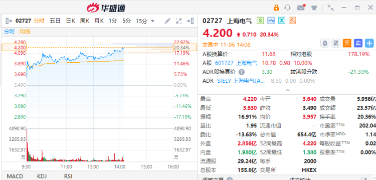 近日机器人相关个股备受市场关注。上海电气(02727.HK)周一到周二累计涨幅超80%。截至发稿,涨20.34%,报4.2港元。上海电气A股此前涨停。