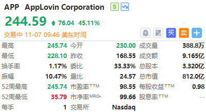 多个绩优股盘初大涨。AppLovin $APP 涨超45%,Q3 GAAP每股收益1.25美元,超预期0.94美元32.98%,Q3营收为11.98亿美元,同比增长38.62%。