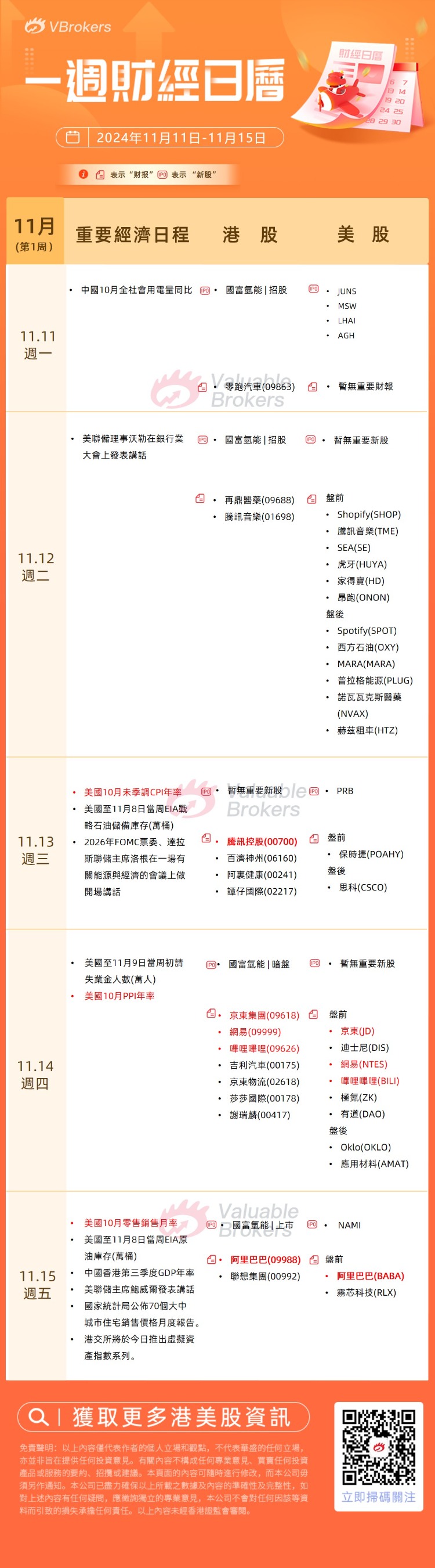 编者按:财报重磅周!腾讯、阿里、京东、网易财报陆续登场;美国10月CPI携手“恐怖数据”来袭;重大宣布!港交所将于11月15日推出虚拟资产指数系列。