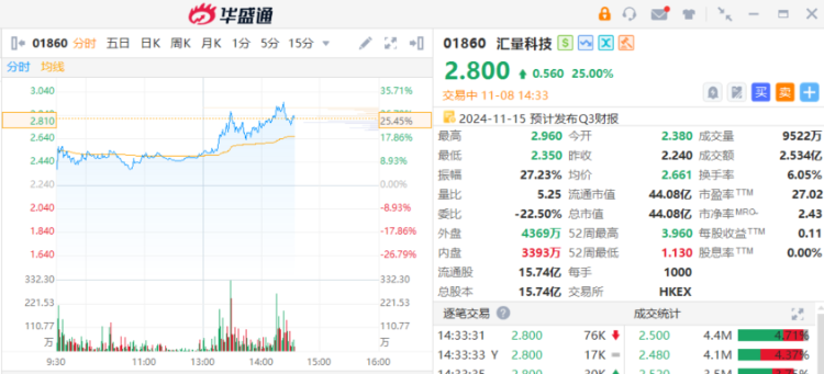 汇量科技 $01860.HK 午后涨超28%,截至发稿,涨25%,报2.8港元,成交额2.534亿港元。