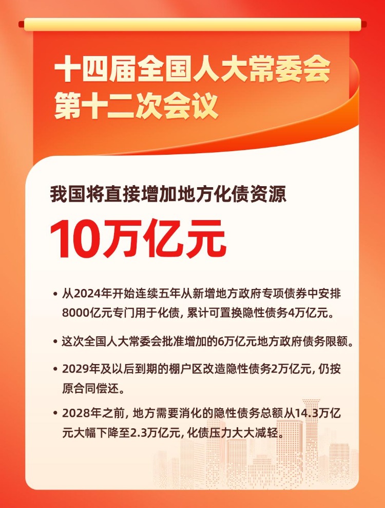 从2024年开始,我国将连续五年每年从新增地方政府专项债券中安排8000亿元,专门用于化债,累计可置换隐性债务4万亿元。再加上这次全国人大常委会批准的6万亿元债务限额,直接增加地方化债资源10万亿元。