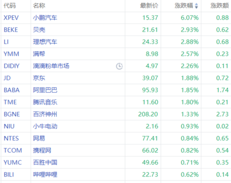 其中,小鹏汽车涨超6%,贝壳、理想汽车、滴滴涨超2%,京东、阿里、腾讯音乐、涨超1%,哔哩哔哩跟涨。