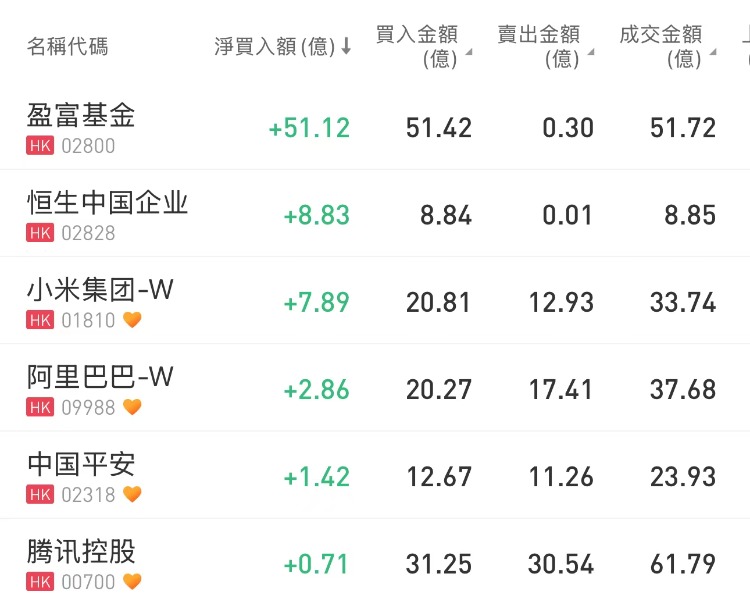 盈富基金、恒生中国企业、小米集团-W分别获南下资金净买入51.12亿港元、8.83亿港元、7.89亿港元;