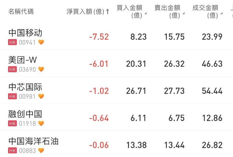中国移动、美团-W、中芯国际分别遭净卖出7.52亿港元、6.01亿港元、1.02亿港元。