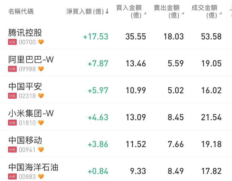 腾讯控股、阿里巴巴-W、中国平安分别获南下资金净买入17.53亿港元、7.87亿港元、5.97亿港元;