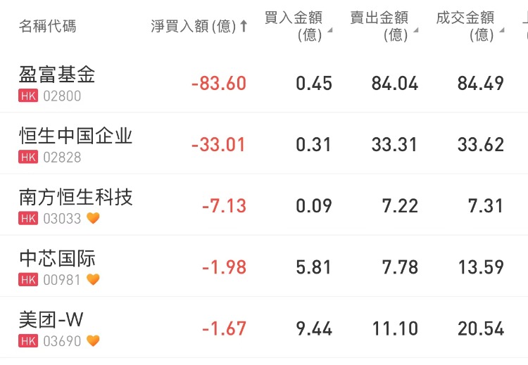 盈富基金、恒生中国企业、南方恒生科技分别遭净卖出83.60亿港元、33.01亿港元、7.13亿港元。