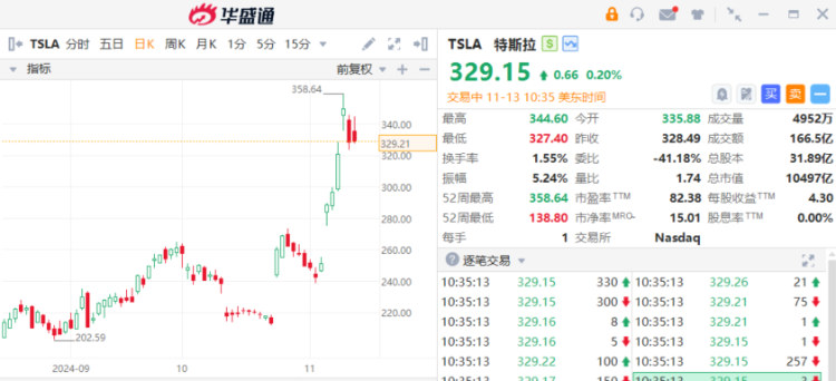 50 Park Investments创始人兼首席执行官Adam Sarhan维持看涨,但他表示,“市场对特朗普胜选的反应,对特斯拉来说是爆炸性的。虽然公司肯定能获得潜在的好处,但目前的涨势在短期内似乎过热。”
