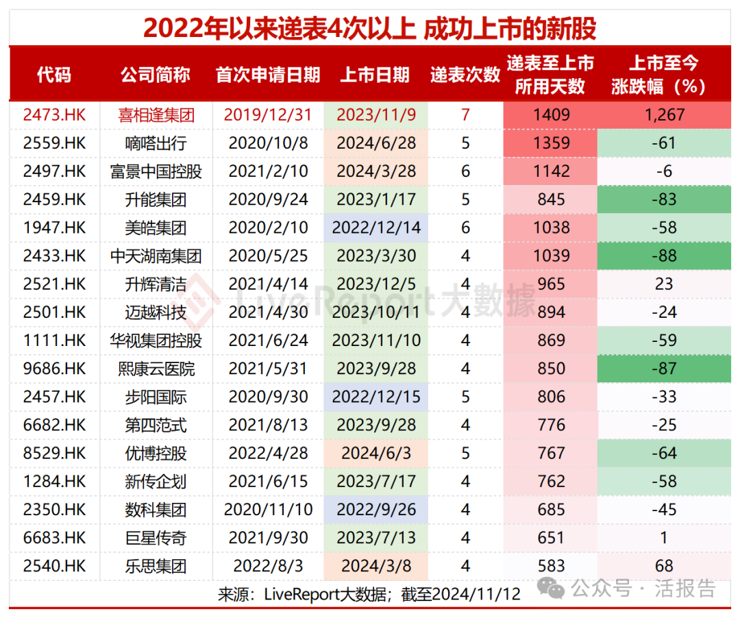 值得一提的是,昔日的递表“钉子户”,在上市后成为了“十倍股”。喜相逢集团递交7次上市申请后,于2023年11月9日顺利在港交所挂牌上市,历时1409天。截至2024年11月12日,喜相逢上市之后股价累计涨幅达到12.67倍。