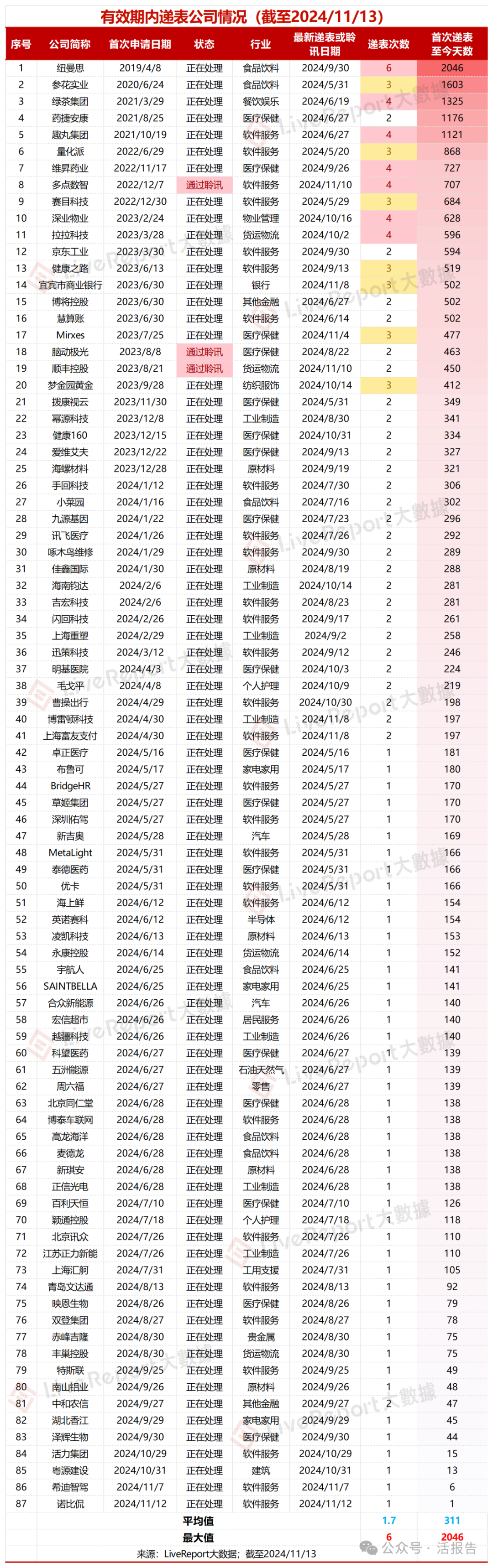 还在有效期内的公司共计87家,占比20.81%,其中递表次数在3次或以上的有14家,包括纽曼思、绿茶集团、多点数智、拉拉科技等。