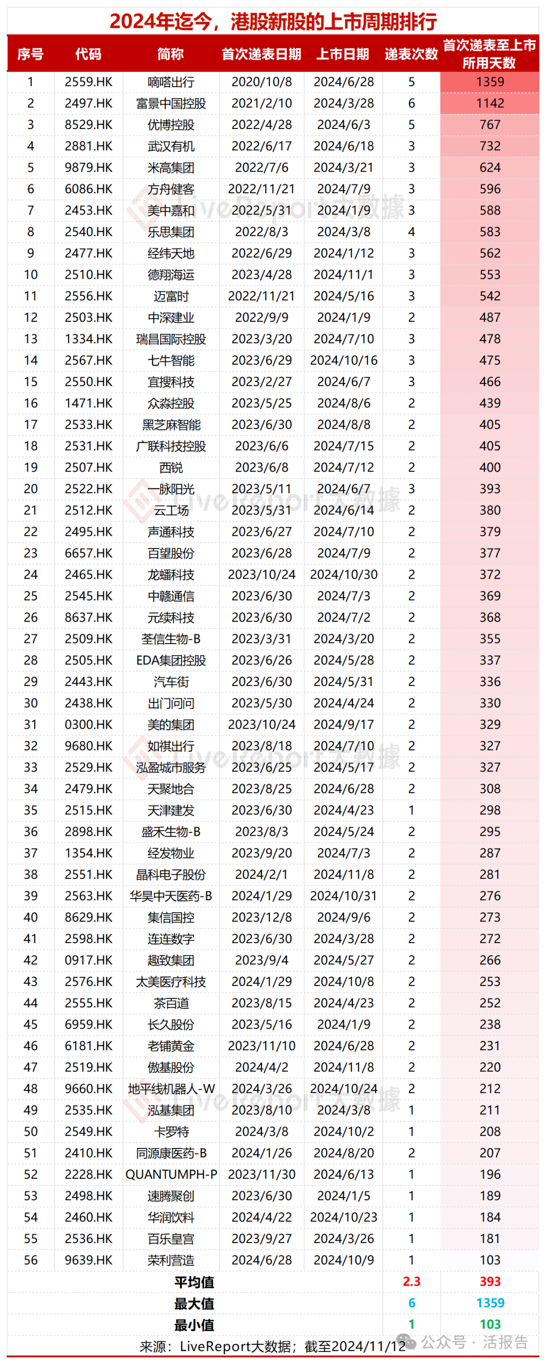 据LiveReport大数据统计,截至2024年11月12日,2024年以来港股共计56宗IPO,平均上市周期较2023年有所缩短。2024年以来上市的新股平均上市周期(首次递交招股书至上市日)约为393天,较2023年的449天所有缩短。