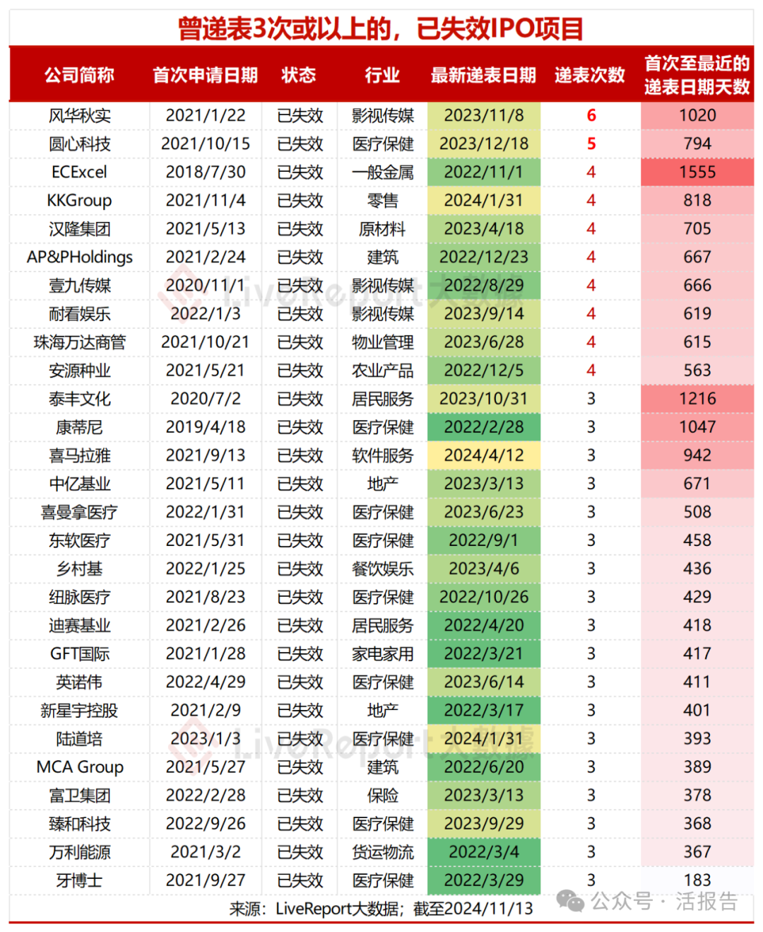 据LiveReport大数据统计,2022年以来已失效的IPO项目共计141家,占比33.7%,递表次数在3次以上的有28家,包括风华秋实、圆心科技等,其中圆心科技曾于2024年2月9日通过港交所上市聆讯,但市场传闻其已暂缓香港上市计划。