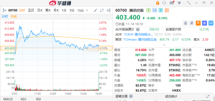 今日腾讯股价低开后一度翻红,截至收盘,微跌0.10%,报403.4港元。