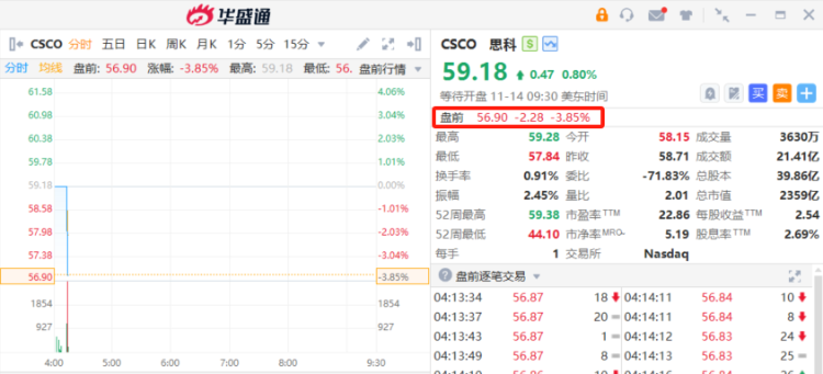 思科盘前跌近4%,第一财季网络业务营收同比下降23%逊于预期。