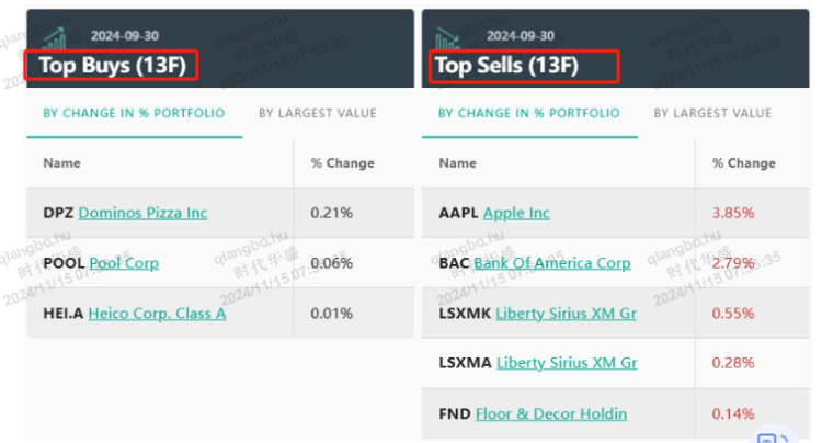 从持仓比例变化来看,前三大买入标的分别是:达美乐比萨、Pool Corp $POOL 、海科航空。其中,达美乐比萨盘后涨超7%,Pool盘后涨超5%, $ULTA 盘后跌4%。