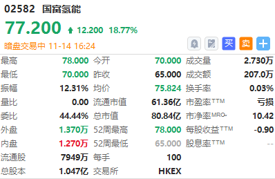 国富氢能( $02582.HK )将于11月15日(周五)在香港挂牌。截至发稿,暗盘交易显示报价77.2港元,较招股价65港元上涨18.77%;每手100股,不计手续费,中签一手赚1220港元。