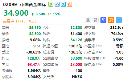 中国黄金国际(02099)绩后大涨11%,现报34.9港元,成交额7949万港元。