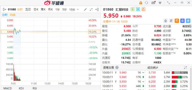 汇量科技(01860)绩后高开,截至发稿,涨19.24%,报5.95港元,成交额3.748亿港元。