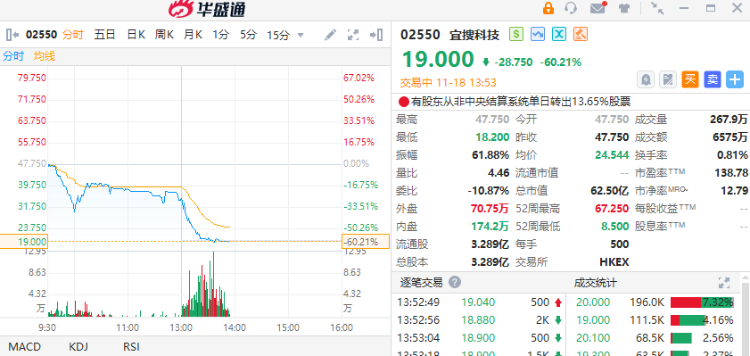 宜搜科技(02550)午后跳水,截至发稿,跌60.21%,报19港元,成交额6575万港元,总市值跌破65亿港元。