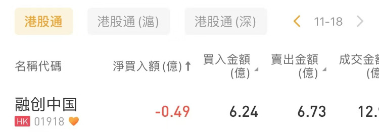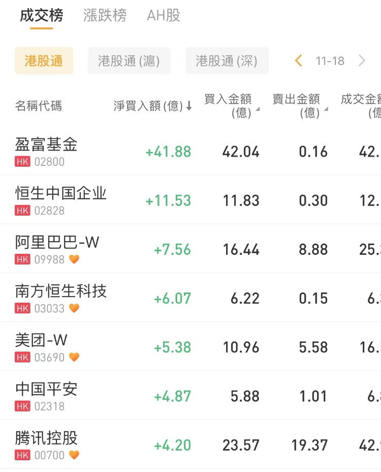 盈富基金、阿里巴巴-W、美团-W分别获南下资金净买入41.88亿港元、7.56亿港元、5.38亿港元。融创中国获南下资金净卖出0.49亿港元。
