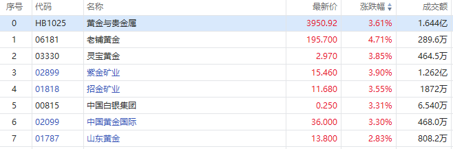 受消息驱动,港股黄金股早盘集体走高,截至发稿,老铺黄金涨近5%,灵宝黄金、紫金矿业、招金矿业、中国白银集团、中国黄金国际涨超3%,山东黄金涨超2%。