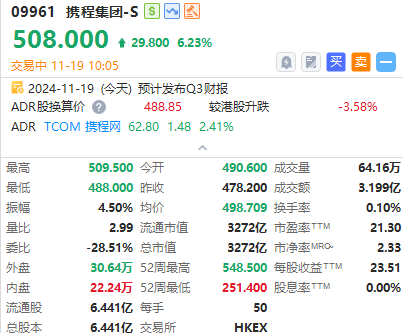 携程集团-S(09961)绩后上涨超6%,现报508港元,成交额3.2亿港元。