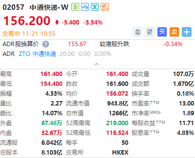 中通快递(02057)绩后股价受压,截至发稿,报156.2港元,跌幅3.34%,成交额1.67亿港元。