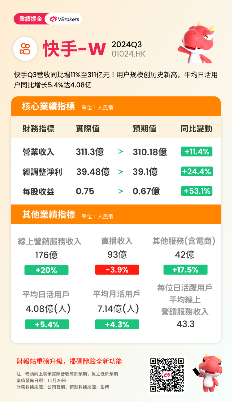 🎦点击预约:快手2024年第三季度业绩电话会 | 11月20日 20:00