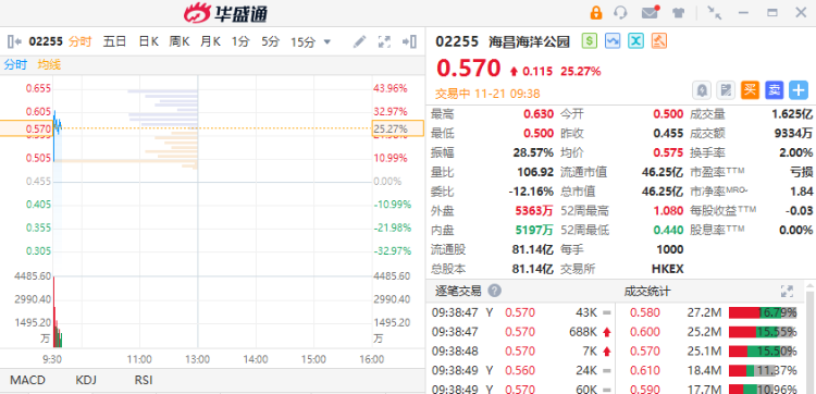 11月21日,海昌海洋公园(02255)复牌高开近10%,昨日盘中曾跌逾30%。截至发稿,涨25.27%,报0.57港元,成交额9334万港元。