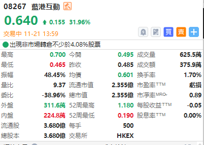 加密货币ETF及相关概念股午后拉升,截至发稿,蓝港互动(08267)涨30%;博雅互动一度涨近20%;嘉实比特币涨近5%;博时比特币涨4.9%。