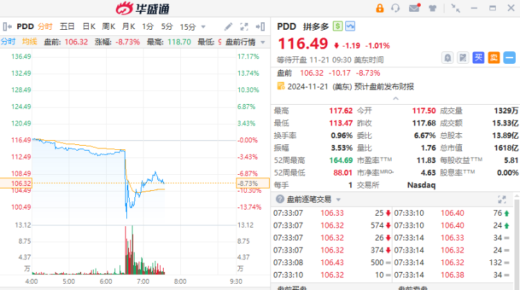 拼多多(PDD)盘前跌超7%,截至发稿,报107.46美元。