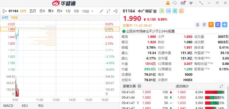 11月22日,中广核矿业(01164)早盘走高,截至发稿,涨6.99%,报1.99港元,成交额6023万港元。