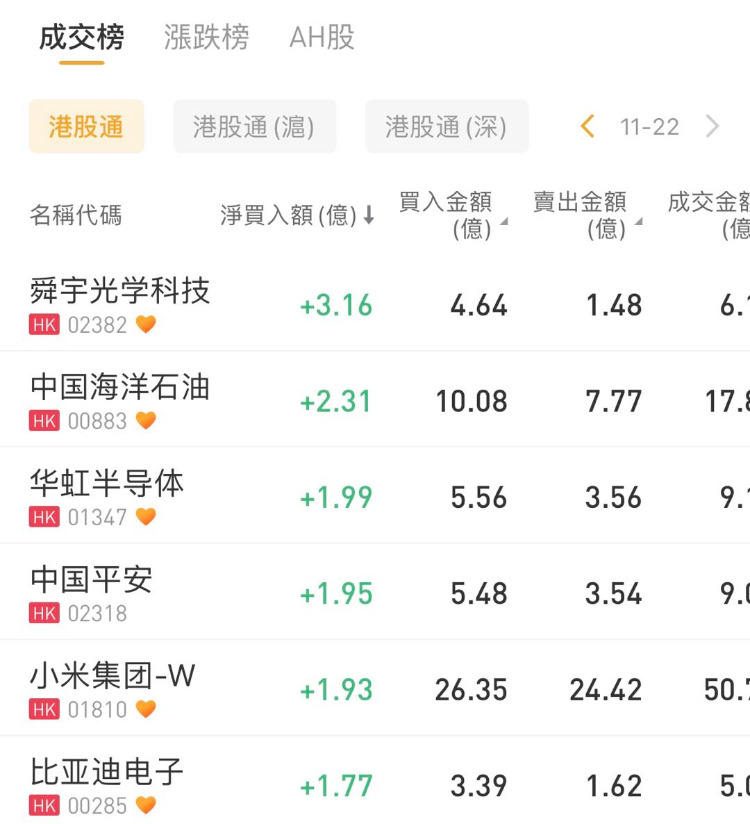 舜宇光学科技、中国海洋石油、华虹半导体分别获南下资金净买入3.16亿港元、2.31亿港元、1.99亿港元。
