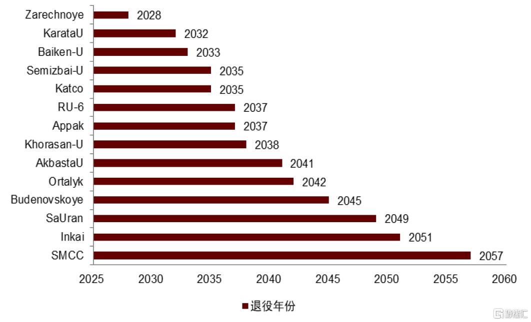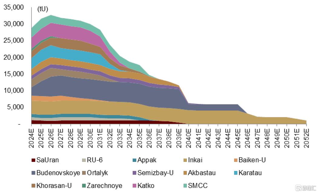 另一方面,全球最大的产铀国哈萨克斯坦也是全球最早开发铀资源的国家之一,其铀矿资源走向枯竭对远期供给的可得性提出了更大的挑战。根据IAEA,2021年哈萨克斯坦在100美元/磅铀价下具有经济性的可回收资源量约占全球的11%,但是2022年哈萨克斯坦的供给量达到了全球一次供给的43%,铀矿资源在之前的开发过程中加速消耗。根据公告,哈原工第一个资源枯竭子公司是与Uranium One合资的Zarechnoye,该公司的铀矿资源规划于2028年退役。根据哈原工公告的产量预测,其天然铀产量将在2029年左右达到顶峰之后逐年下行,至2040年的产量不及巅峰时期的一半。
