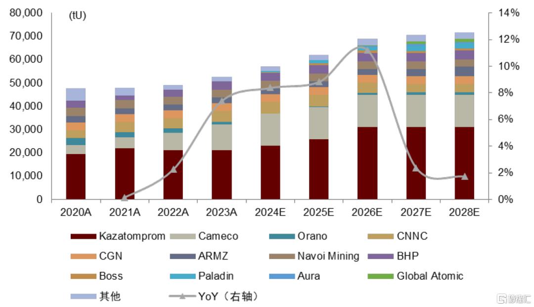 从总量上看,短期铀矿一次供给集中释放,但是相对需求仍然存在明显缺口。2020-2022年全球天然铀供给温和回升,主要增量来自于Cameco重启McArthur River铀矿,至2022年全球天然铀一次供给量达到4.9万tU,期间天然铀供给CAGR为1.2%。受到价格回暖的驱动,我们预计前期准备复产或重启建设的天然铀矿山将在2023-2026年期间集中释放供给增量,哈萨克斯坦铀矿的产能利用率提升也将形成可观的供给增长,期间全球天然铀供给CAGR达到9.4%。2027年开始由于新增项目有限,我们预计全球天然铀的供给增速将大幅放缓,全球天然铀一次供给将在2028年达到7.1万tU。
