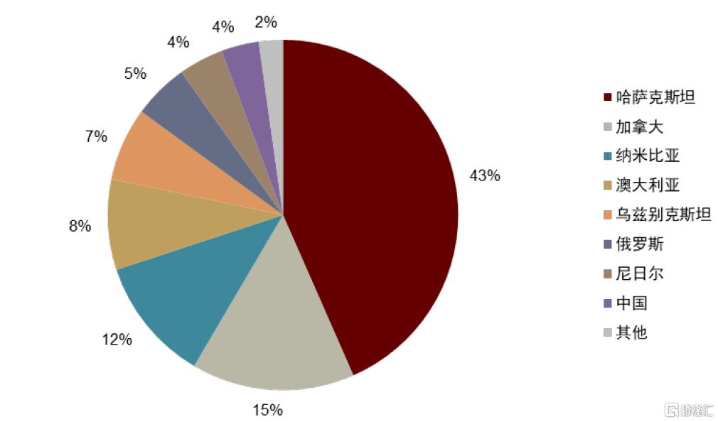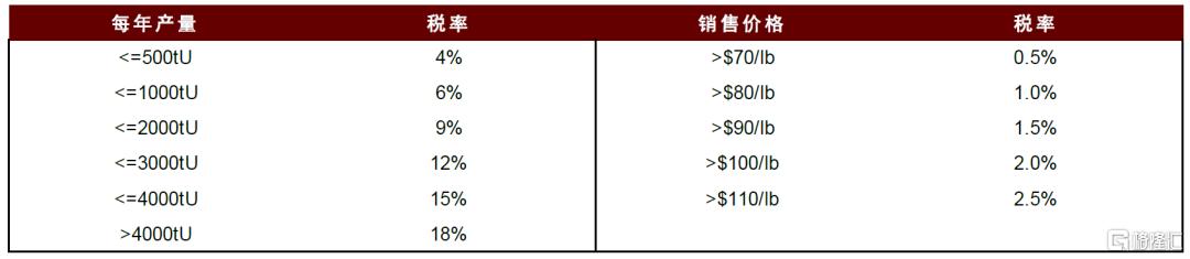 ► 哈萨克斯坦:哈萨克斯坦国有企业哈原工(Kazatomprom)控制国内所有铀矿的开发活动,为全球最大的天然铀生产商,2022年哈萨克斯坦共生产天然铀2.12万tU,占全球的43%。哈萨克斯坦铀矿供给的扰动因素主要有二,一是硫酸短缺,硫酸是哈萨克斯坦利用原位地浸法(ISL)生产天然铀的主要原材料,除铀矿生产外主要用于农业化肥领域。受到农业需求增长和供应链问题影响,哈萨克斯坦的硫酸供给偏紧,哈原工将2025年的产量指引从原来的3.05-3.15万tU下降到了2.50-2.65万tU,未来哈原工规划通过建设硫酸厂和寻找新的供应来源以解决硫酸问题。二是政策变化,在铀矿资源面临枯竭且国家财政偏紧的背景下,我们认为哈萨克斯坦对于本土铀矿资源开发思路将更倾向于使其价值贡献达到最大化,这可能一定程度上抑制供应增长。2024年7月哈萨克斯坦将铀矿开采的MET税修改为对于产量更为敏感的阶梯税率,使国内铀矿扩产的经济性下降。[12]