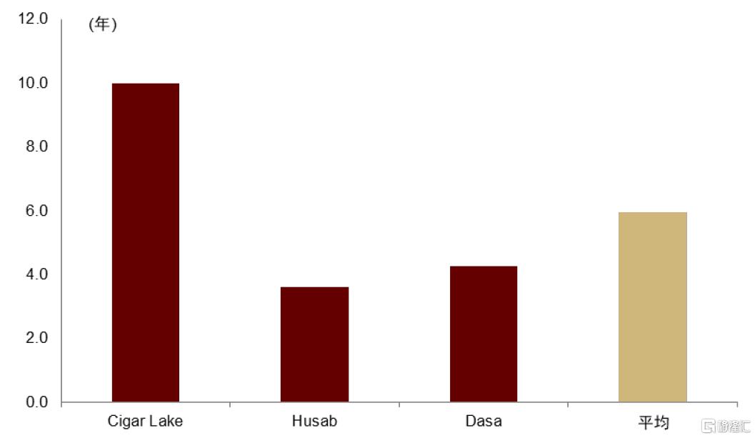 一是时间上远期供给的稀缺性。天然铀矿山的供给具有较强刚性,资源项目从勘探到投产的周期长,一般铀矿勘探的阶段需要10-20年的时间,开发和产能建设阶段需要3-10年的时间。即使对比其他金属品种,铀矿的建设周期也位于较长水平。这意味着即使现在完成天然铀资源的勘探,新的铀矿项目投入生产可能也至少要在2029年或者之后,难以快速释放供给增量。