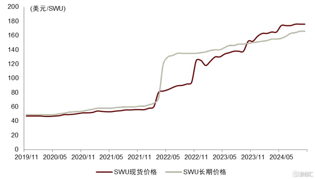 ► 政策变化:2024年5月,美国总统正式禁止进口部分国家的浓缩铀,除非获得美国能源部的豁免,豁免进口量都将受到限制,且仅能持续至2028年1月1日[14]。2024年11月15日,俄罗斯政府宣布实施浓缩铀的出口限制措施[15],但是根据俄联邦技术和出口管制局颁发的一次性许可的供货除外。我们认为,美国规划自建核电产业链以实现多元化浓缩铀供给来源的目的,但是需要较长的时间,俄罗斯的临时出口限制政策有望带动铀价上行,若限制措施加码供需矛盾或将进一步加剧。