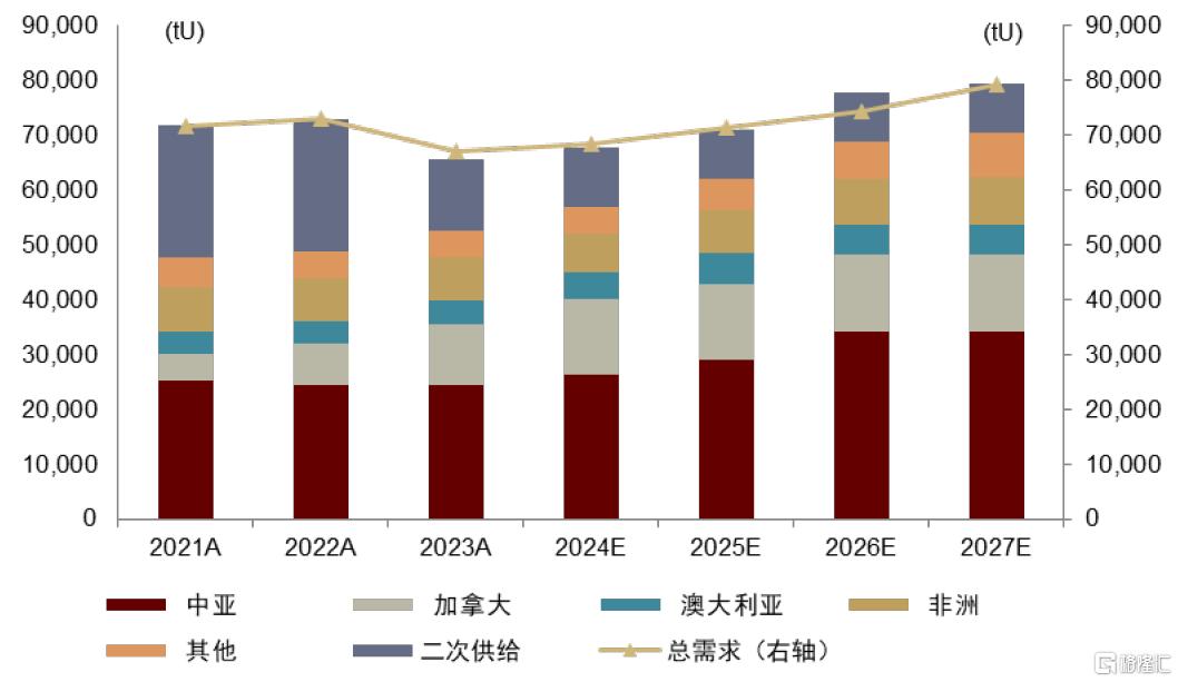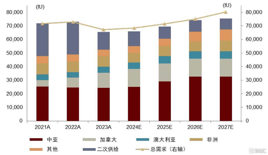 图表22:2024-2027年天然铀供需平衡(乐观情况)