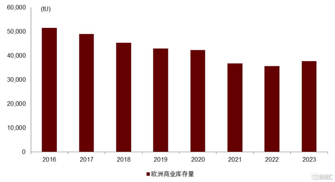 从结构看,我们对全球主要核电需求国家的商业库存进行梳理。一是根据EIA,2023年美国合计的商业库存约5.8万tU,其中美国供应商持有的库存1.6万tU,核电运营商持有的库存4.2万tU,从2018年至今美国的商业库存量持续增加,其中核电运营商持有的库存基本不变,但是供应商持有的库存持续增加。二是根据ESA,欧盟国家的公用事业公司合计持有天然铀库存3.8万tU,包括在铀燃料循环中不同阶段的产品形式,相比2018年4.5万tU的水平有较大幅度的下降,若按照欧盟国家每年需求量1.2万tU计算,商业库存量约相当于三年需求的库存周转。三是根据IAEA,中国在2021年根据进出口需求倒算的库存量约12.9万tU,印度持有的库存量约0.96万tU。四是在福岛核事故之后由于核电站的大面积关停,日本的商业库存存量持续位于较高水平,根据IAEA,日本的核电运营公司在2021年拥有以各种形式存在的商业库存价值约192亿美元,估计的库存总量约4.2万tU。
