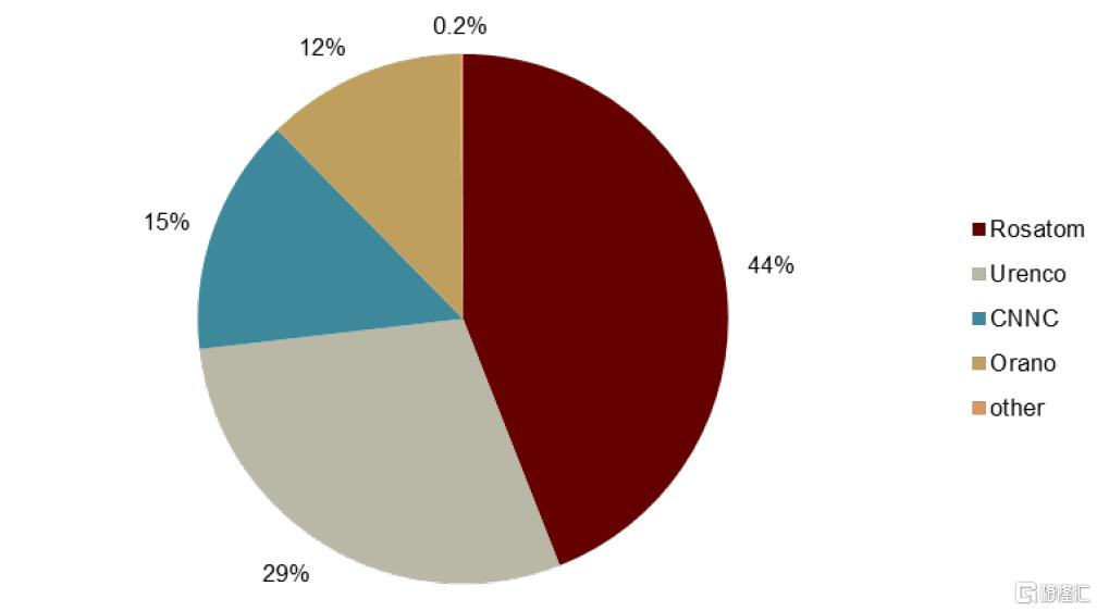 再浓缩尾料和欠料供给受到浓缩产能影响。再浓缩尾料和欠料供应都来自于天然铀的浓缩环节,在浓缩产能过剩和浓缩价格比较低的时候,浓缩厂处于经济性最大化和保持离心机运作的考虑,会选择提高离心机的产能利用率,通过减少天然铀的投入或者使用再浓缩尾料降低原材料的消耗量。反过来看,在浓缩产能偏紧张的时期,使用再浓缩尾料的经济性明显下降,浓缩厂更倾向于投入更多原材料而减少离心机的产能利用率,这使欠料供应减少甚至转化为过料供应形成对天然铀的二次需求。天然铀浓缩是具有战略敏感性、技术难度大、资本强度高的行业,这使增加新的浓缩产能具有明显的壁垒,海外浓缩市场的主要供应商包括Orano(欧安诺集团)、Rosatom(俄罗斯国家原子能公司)和Urenco(欧洲铀浓缩公司),中国原子能工业公司主要供应国内的浓缩需求。